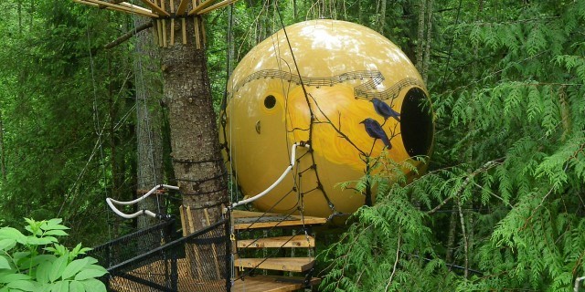 Được tạo bởi kiến trúc sư Tom Chudleigh trong suốt 20 năm xây dựng, ngôi nhà treo lủng lẳng trên cây được neo giữ bởi một hệ thống dây thừng phức tạp, lối đi lên nhà uốn lượn cầu kỳ xung quanh thân cây. |