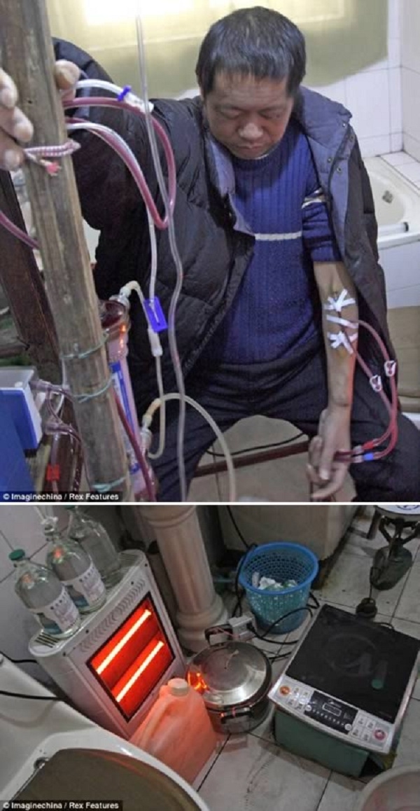 Hu Songwen bị bệnh gan khi còn là sinh viên đại học. Sau 6 năm chạy máy lọc máu, ông hết sạch tiền. Nhưng tới nay, ông Hu đã sống được thêm 13 năm. Tất cả là chỉ nhờ chiếc máy lọc máu làm từ một vài dụng cụ nấu bếp và một số thiết bị y tế cũ.