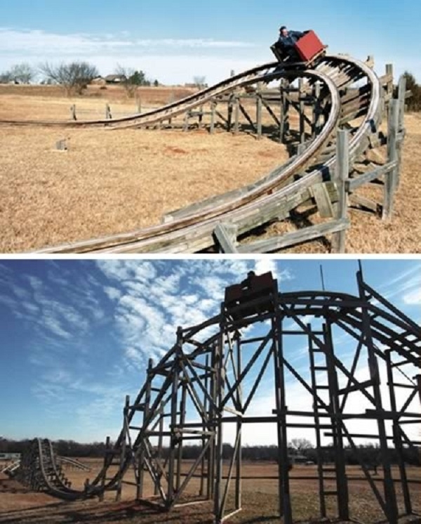 Jeremy Reid chỉ mất 10.000 USD để tạo ra một chiếc tàu lượn siêu tốc trên mảnh đất 10 héc-ta của gia đình tại Oklahoma, Hoa Kỳ. Tàu lượn này có tốc độ lên tới hơn 15 dặm/giờ.
