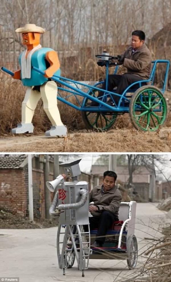 Wu Yulu, một nông dân ở ngoại thành Bắc Kinh, đã tự xây dựng được cho mình 47 con robot có khả năng nhảy nhót, vẽ vời, mát xa... Do đó, một chiếc xe chở người do robot kéo cũng không có gì là đặc biệt.