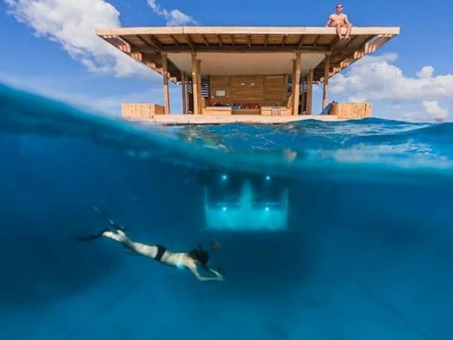 | 10. Phòng khách sạn dưới nước - Zanzibar: Manta Resort là một khu nghỉ dưỡng nằm trên đảo Pemba ở Zanzibar và được bao quanh bởi những cửa sổ kính lớn để du khách có thể chiêm ngưỡng toàn bộ thế giới sinh vật biển đầy màu sắc như san hô hay các loại cá.