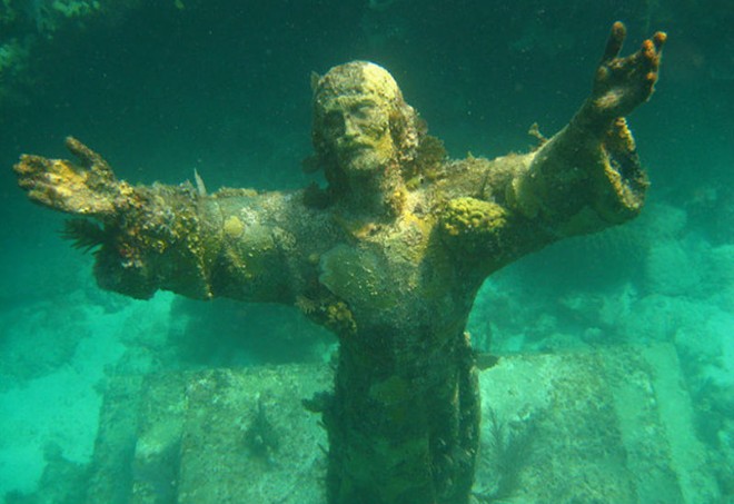 | 13. Bức tượng Christ of the Abyss - Key Largo, Florida, Mỹ: Christ of the Abyss là bức tượng chúa Jesus bằng đồng được đặt sâu dưới đáy bờ biển Key Largo, Florida, Mỹ vào năm 1965. Bức tượng là một bản sao của bản gốc "Il Cristo Degli Abissi", được đặt tại vùng biển Địa Trung Hải ngoài khơi bờ biển của Ý vào năm 1954. |