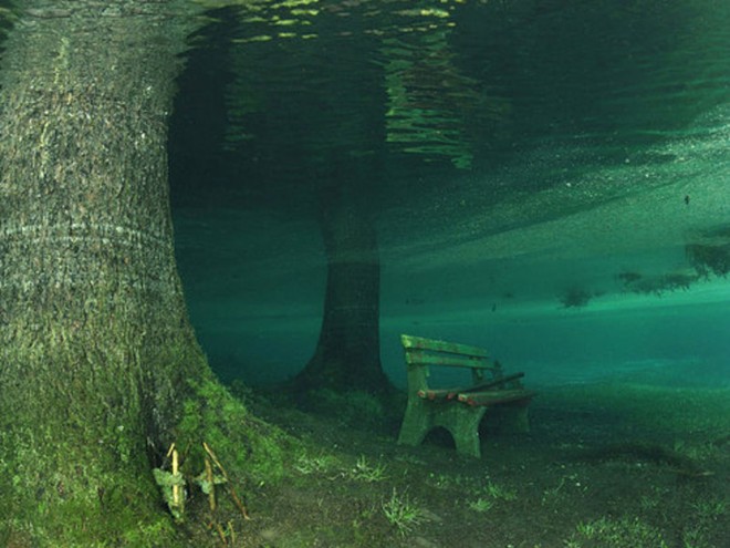 | 4. Hồ Green Lake - Tragoess, Áo: Nằm ở chân dãy núi Hochschwab, Tragoess, nước Áo, hồ Green Lake không phải là một công viên bình thường. Mỗi năm một lần vào mùa hè khi nhiệt độ tăng, tuyết và băng bao phủ đỉnh núi bắt đầu tan chảy, nước đổ xuống làm công viên này chìm hoàn toàn trong nước. Nó trở thành một điểm đến thu hút các thợ lặn trên toàn thế giới.