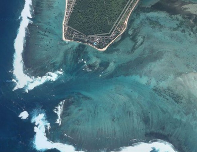 | 5. Thác nước dưới biển - Đảo Mauritius: Mauritius là một quốc đảo nằm ngoài khơi Ấn Độ Dương và hiện tượng thác nước dưới biển là một ảo ảnh do một dòng chảy của cát và bùn khoáng dưới lòng biển như đổ xuống. Hiện tượng này chỉ đẹp khi được chiêm ngưỡng từ trên máy bay hay trực thăng.