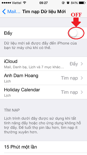 Cách khắc phục: Chọn Cài đặt > Mail, Danh bạ và Lịch > Tìm nạp Dữ liệu Mới. Tiếp theo, chuyển thanh trượt của "Đẩy" về trạng thái OFF. Tiếp tục kéo xuống dưới mục "Tìm nạp" và chọn "Thủ công". Sau khi hoàn tất các bước trên, email mới giờ đây sẽ chỉ xuất hiện khi bạn mở ứng dụng hộp thư.