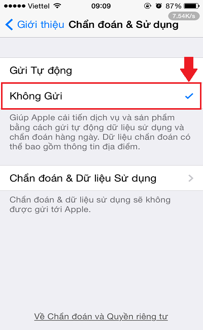 Cách khắc phục: Truy nhập vào Cài đặt > Cài đặt chung > Giới thiệu > Chẩn đoán & Sử dụng và tích vào"Không Gửi" để vô hiệu hóa tính năng tự động gửi phản hồi cho Apple.