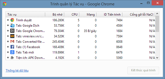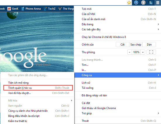 Nếu cảm thấy Chrome chạy chậm sau vài giờ sử dụng liên tục, cách khắc phục đơn giản nhất đó là khởi động lại trinh duyệt. Tuy nhiên, hiện tượng Chrome chạy chậm cũng có thể là do những extension hay là một trang web nào đó. Bạn có thể khắc phục nhanh tình trạng trên bằng cách mở Menu -> Công cụ -> Trình quản lý tác vụ rồi chọn tắt các tab hay extension chiếm nhiều dung lượng.