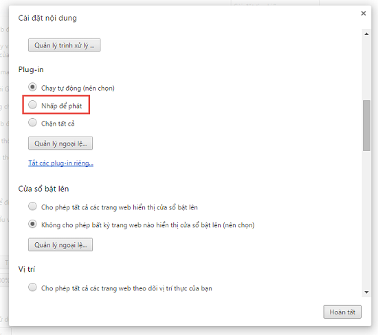 Mặc dù hầu hết các trang web đều chuyển sang HTML5 tuy nhiên vẫn còn một số người dùng Flash Player. Bạn có thể truy cập trang sau từ thanh địa chỉ: chrome://settings/content, chọn "Nhấp để phát" ở mục Plugins. Khi đó, nếu một trang web nào yêu cầu Flash, trang đó sẽ cần hỏi quyền truy cập của bạn và khi nào bạn đồng ý, trang đó mới được quyền sử dụng Flash.