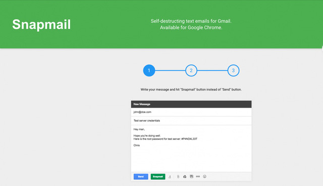 Cũng là một Chrome extension, Snapmail cho phép bạn thêm nút Snapmail cạnh nút Gửi trên Gmail của mình để gửi email tự hủy. Nút Snapmail này sẽ mã hóa email của bạn. Ngay khi người nhận mở mail và bấm vào đường link Snapmail bạn gửi, họ sẽ có đúng 60 giây để đọc email của bạn trước khi nó biến mất. Loại email phù hợp với các thông báo ngắn hay email chia sẻ mật khẩu.