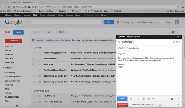 Boomerang là một plug-in cho Chrome, Firefox và Safari. Ứng dụng này có khá nhiều tính năng nhưng có lẽ nổi trội nhất vẫn là tính năng “Send later” (Gửi sau). Bạn có thể viết một đoạn mail như bình thường rồi chọn ngày trên Google Calendar hoặc đơn giản là click vào “next Monday” (thứ hai tới) để hẹn giờ gửi. Bạn cũng có thể cài một mail nhắc nhở mình check và theo dõi email này.