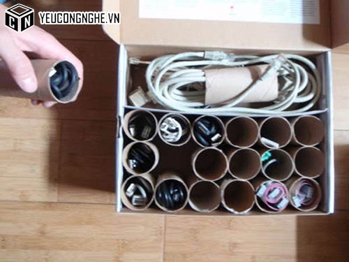 5. Dùng cuộn giấy vệ sinh để sắp xếp những cáp và dây gọn gàng
