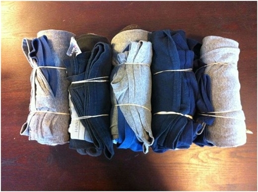 Nếu bạn muốn tiết kiệm không gian khi đóng gói đồ đi du lịch, hãy cuộn tròn quần áo như trong hình và cố định 2 đầu bằng dây thun.