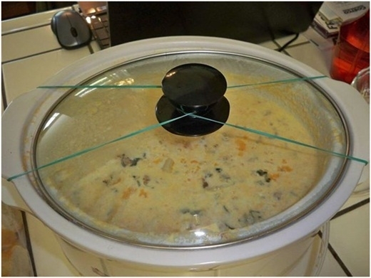 Bạn hãy buộc cố định nắp nồi lại theo hình chữ X thế này. Hai đầu thun móc vào tay cầm là vừa đẹp.