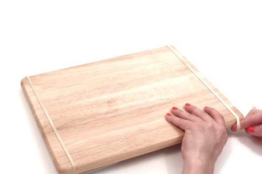 Bạn hãy dùng hai sợi thun buộc hai bên thớt để giữ cho nó cố định nhé.