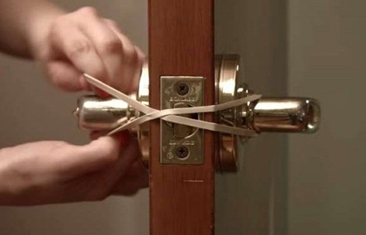 Hãy buộc thun thành hình chữ X ở hai tay nắm hai bên mặt cửa. Thun sẽ cố định cái chốt trong cánh cửa để nó không bật ra mà khóa cửa lại nữa.