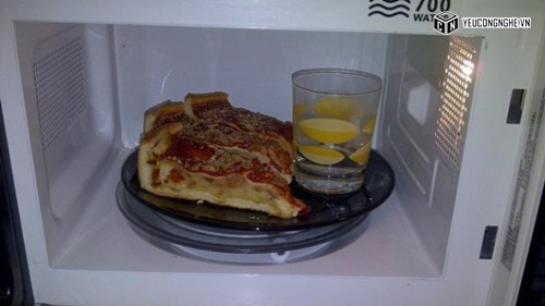 Để hâm nóng bánh pizza qua đêm mà không làm cho nó dai, bạn hãy đun nóng với một ly nước trong lò vi sóng.