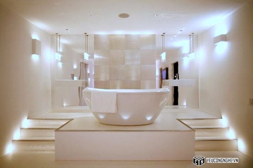 Thay vì đặt đèn trên trần hoặc trên tường, tại sao không phòng tắm của bạn? Một cảm giác thư giãn thật tuyệt