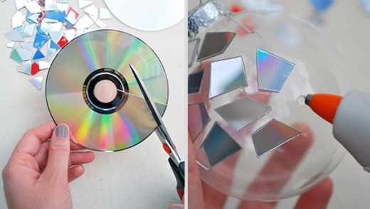Bạn có thể mua những quả cầu trang trí trơn từ cửa hàng. Cắt những chiếc CD cũ thành những mảnh nhỏ và dùng keo dán chúng lên quả cầu, vừa tận dụng được đĩa CD có sẵn mà vừa có thể khiến cây thông của bạn trở nên độc nhất vô nhị nữa đấy.