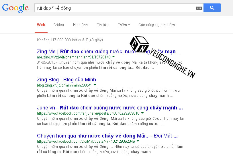 Không nhớ tên và muốn tìm bài hát bạn nghe? Điền vào chỗ trống dấu (*) các đoạn bạn quên hãy thay bằng dấu hoa thị và Google sẽ cố gắng để hoàn thành tìm kiếm của bạn cho bạn.
