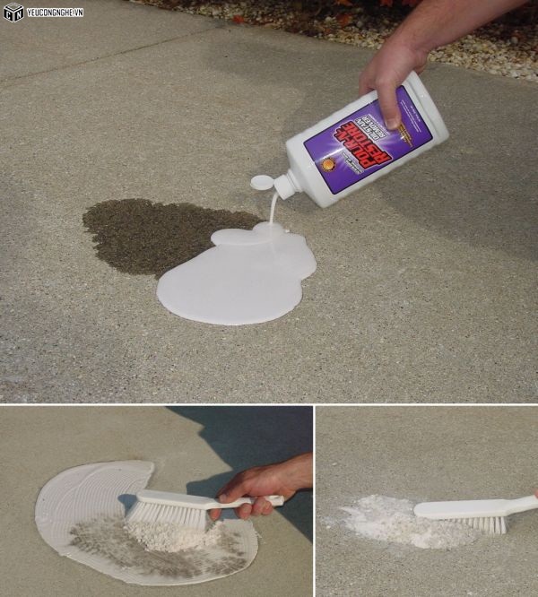 Vết dầu đen trên đường lái xe trông quả thực không đẹp mắt, nhưng loại bỏ chúng không phải là điều dễ dàng, trừ khi bạn sử dụng dung dịch Pour-N-Restore. Đó là một giải pháp mà dung dịch sẽ khô thành bột và hấp thụ tất cả các vết dầu bẩn dính trên đường.
