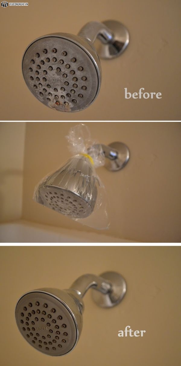 Để làm đầu vòi tắm hoa sen nhà bạn trông như mới, bạn hãy sử dụng giấm và một chiếc túi ni lông. Hãy đổ giấm vào túi và buộc vào đầu hoa sen. Ngâm nó trong một giờ và lau sạch bằng khăn ướt.