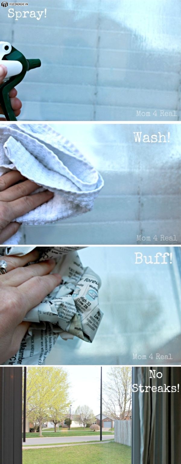 Chỉ sử dụng nước, giấm và xà phòng sẽ giúp của kính nhà bạn sáng bóng, không một vết mờ. Trộn hỗn hợp này lại với nhau sau đó sử dụng một miếng vải trắng để lau cửa kính và lau khô lại với một tờ báo.