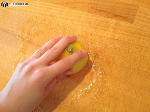 Bạn có thể nhận thấy rằng thớt gỗ thường bẩn và khó rửa sạch. Do đó, đây là cách để bạn có thể làm sạch chúng. Bạn cần dùng 2 muỗng canh giấm trắng, 1 chén nước, ½ trái chanh, muối biển, dầu thực vật và một chiếc khăn. Lau thớt với hỗn hợp giấm và nước. Cắt chanh ra làm đôi, ngâm nó trong muối biển. Lau thớt bằng nước này. Sau đó, nhúng khăn vào dầu thực vật rồi lau thớt lại.