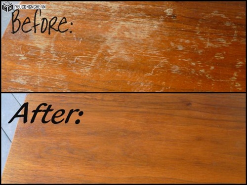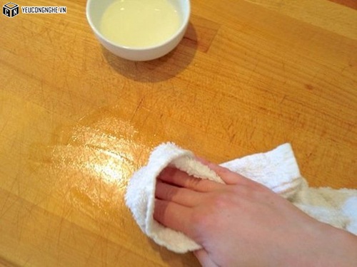 Nếu bạn có một cái bàn gỗ cũ với đầy những vết trầy xước xấu xí, đừng vội vứt nó đi, bạn có thể khắc phục được nhờ hỗn hợp sau. Trộn ½ chén dấm với ½ chén dầu ô liu, nhúng một miếng vải vào trong hỗn hợp trên và chà mạnh nó vào gỗ. Các vết trầy xước sẽ hoàn toàn biến mất và gỗ sẽ lại trông như mới. {Theo trang domesticblisssquared}.