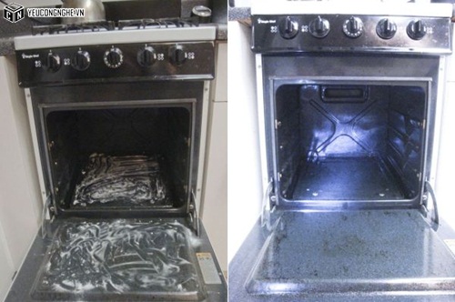 Để làm sạch lò nướng, bạn có thể trộn bột soda và dấm. Bạn cũng cần thêm một chiếc bát và một chiếc thìa. Cạo các mảnh vụn bẩn ra bằng thìa. Sau đó rắc bột soda trên tất cả các sàn của lò nướng. Sau đó phun giấm trong baking soda lên bề mặt bếp, rồi đổ dấm lên. Hãy để hỗn hợp này trong 10-20 phút. Cuối cũng chà theo chuyển động tròn.