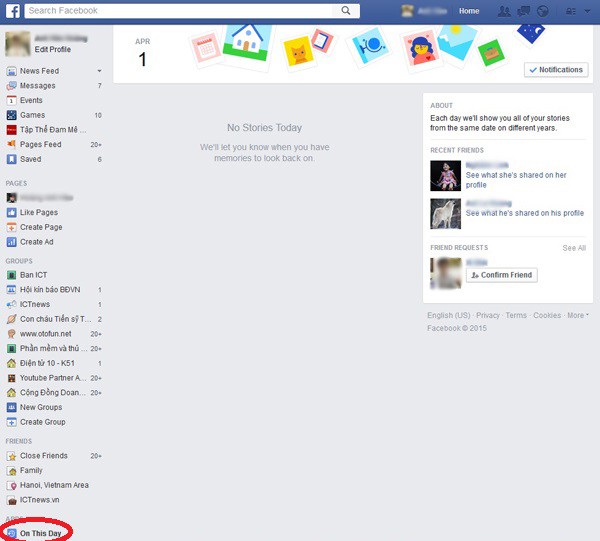 Tìm lại “ngày này năm xưa” trên Facebook: Bây giờ khi muốn tìm lại hoạt động ngày này năm xưa trên Facebook, hãy tìm mục On This Day (khoanh đỏ) ở cột trái.
