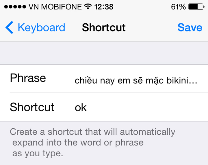 Đối với trường hợp của tôi, hắn thường sẽ trả lời là "Ok", vì vậy tôi sẽ vào autocorrect trong điện thoại của hắn (setting ->general-> keyboard->add new shortcut) và hiệu chỉnh cho mỗi lần type chữ "Ok" iPhone sẽ tự động sửa thành "Ok chiều nay em sẽ mặc bikini hồng cánh sen", rồi lưu lại và tạm dừng tại đây. Sau đó bạn có thể nhắn cho nạn nhân rằng "ê ku chiều nay đi đá banh không", theo thói quen hắn sẽ trả lời là "Ok" và tiện tay bấm luôn send mà không kiểm tra lại. Và đương nhiên tôi sẽ nhận được một đoạn tin nhắn vô cùng thú vị. Nhưng nhớ là chiêu này chỉ thực hiện được khi bạn trộm được iphone của hắn.