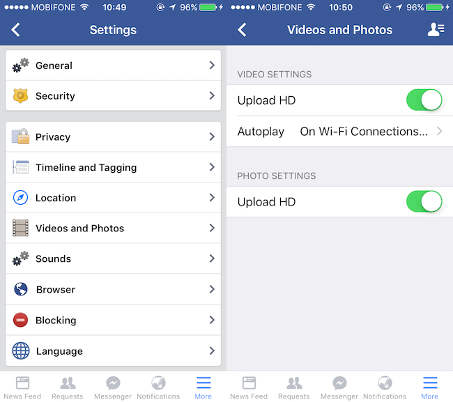 Để tiết kiệm dữ liệu di động (3G/4G), người dùng nên vô hiệu hóa tính năng tự phát video bằng cách mở ứng dụng Facebook, chạm vào mục More > Settings > Account Settings > Videos and Photos > Autoplay > Never Auto-plays Videos.