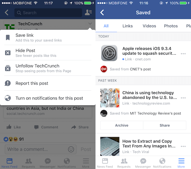 Khi sử dụng Facebook, bạn có thể lưu lại các bài viết, liên kết trang hoặc video để xem lại sau, bằng cách chạm vào biểu tượng mũi tên ở góc phải bài viết và chọn Save link hoặc Save video. Nếu muốn xem lại những thứ đã lưu, người dùng chỉ cần vào mục More > Saved.
