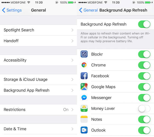 Facebook, Messenger hay Snapchat đều là những ứng dụng "ngốn" rất nhiều pin trên iPhone. Về cơ bản, đa số các ứng dụng trên đều chạy nền để "làm mới" thông tin, giúp bạn không bỏ lỡ các thông báo quan trọng. Tuy nhiên, nếu cảm thấy không cần thiết, người dùng có thể vô hiệu hóa bằng cách truy cập vào phần Settings trên iPhone, chọn General > Background Apps Refresh và vô hiệu hóa các ứng dụng tương ứng.
