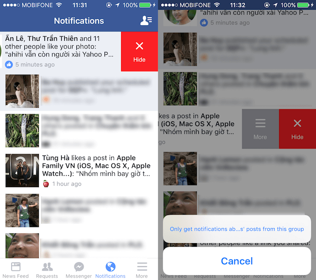 Khi bị tag vào một cuộc trò chuyện trên Facebook, bạn sẽ phải nhận rất nhiều thông báo không mong muốn. Do đó, người dùng có thể vô hiệu hóa bằng cách truy cập vào mục Notifications, vuốt sang trái rồi chọn Hide hoặc More để chặn thông báo từ một trang hay một người cụ thể.