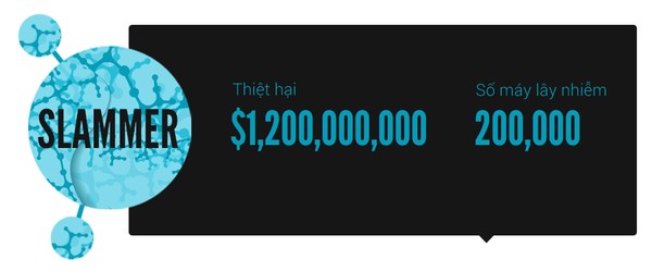 Theo thống kê, Slammer đã lây nhiễm trên 200.000 máy tính cá nhân đồng thời gây thiệt hại 1.200.000.000 USD. Trong danh sách nạn nhân của virus này thậm chí còn có một nhà máy điện hạt nhân ở Ohio, Hoa Kỳ.