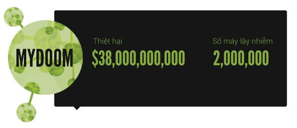 Đứng đầu trong danh sách các virus nguy hiểm nhất là My Doom với “thành tích” 2 triệu máy tính lây nhiễm cùng thiệt hại 38 tỷ USD. Khi người dùng mở các email có chứa My Doom, các đoạn mã độc sẽ tự động được tải về và chiếm trọn danh bạ Outlook của người mở để tiếp tục tiến trình lây nhiễm. Virus này chỉ mất đúng 2 giờ đồng hồ để đạt đến mức độ lây nhiễm trên diện rộng.