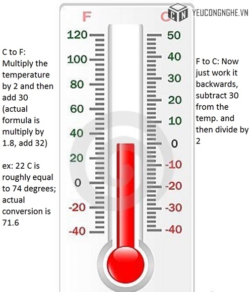 C => F: nhân 2 cộng 30 (ví dụ:22 độ C= 22x2+30=74, nhiệt độ chính xác là 71,6 độ)