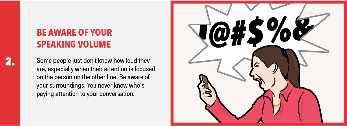 Một vài người không nhận ra họ đang nói lớn như thế nào, đặc biệt khi họ chỉ chú tâm vào cuộc hội thoại với người gọi. Nói ở mức vừa phải sẽ không làm ảnh hưởng đến những người xung quanh. Ngoài ra, nó còn giúp bạn đảm bảo không ai có thể nghe được những "bí mật" bạn và người kia đang trao đổi.