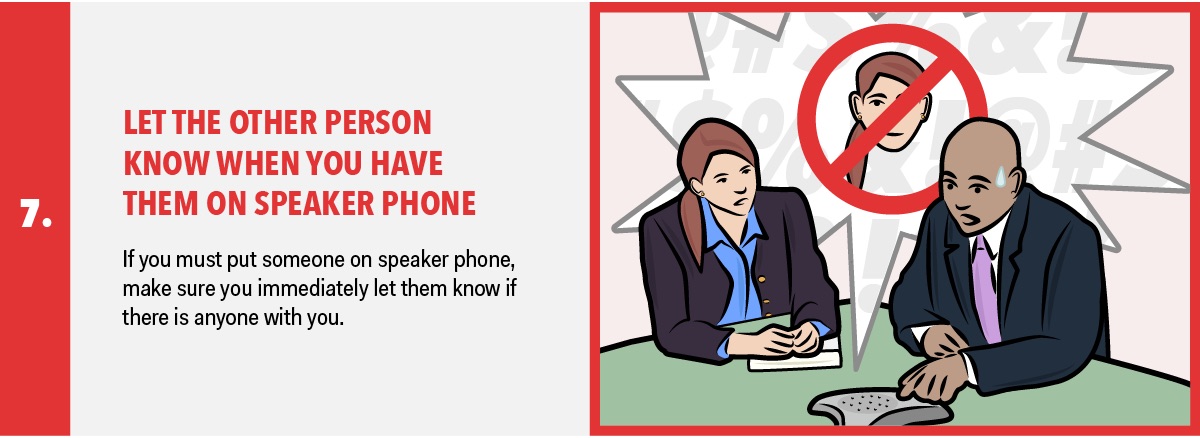 Nếu cần thiết phải bật loa điện thoại, bạn nên cho người gọi biết về điều này kèm theo đó là thông tin những người đang ngồi cùng với bạn. Những điều này giúp người gọi đưa ra cách ứng xử hợp lý trong câu chuyện giữa bạn và họ.
