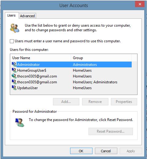 - Bước 3: Chọn tài khoản bạn đang dùng rồi bỏ chọn ở mục "Users must enter a username and password to use this computer"