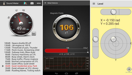 Điện thoại của bạn có đầy đủ các loại cảm ứng như bộ gia tốc, con quay hồi chuyển, nhiệt kế... Nhờ đó, bạn có thể dùng điện thoại như một máy dò kim loại, la bàn, công cụ phát hiện rung..... Những chức năng này thường được kích hoạt thông qua một ứng dụng tiện ích cụ thể, chẳng hạn như Smart Tools. Hãy tải chúng về máy để phòng khi bạn cần đến chúng trong tương lai.