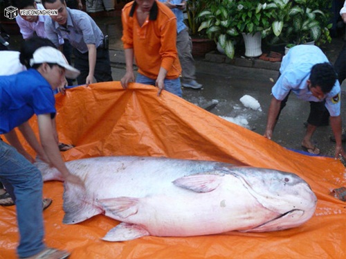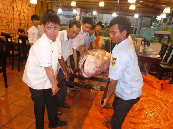 Con cá tra khổng lồ này đã được một ngư dân Campuchia dùng lưới bắt được tại Biển Hồ (Campuchia), sau đó một nhà hàng tại quận 7, TP.HCM mua về.