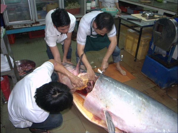 Được biết, con cá dài hơn 2m và nặng gần 230 kg, được ghi nhận là loại cá nước ngọt lớn nhất có mặt tại TP.HCM. Sau khi xẻ thịt, chế biến cho thực khách, giá trị con cá khi bán ra thị trường ước tính khoảng 350 triệu đồng (tương đương hơn 1,5 triệu đồng/kg).