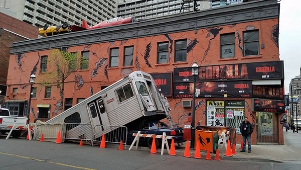Cảnh tượng đổ nát tan hoang sau khi góc phố này bị thằn lằn khổng lồ Godzilla tấn công là một hình ảnh sẽ để lại dấu ấn khó phai trong mắt người đi đường, khiến họ không thể không đến rạp xem phim.