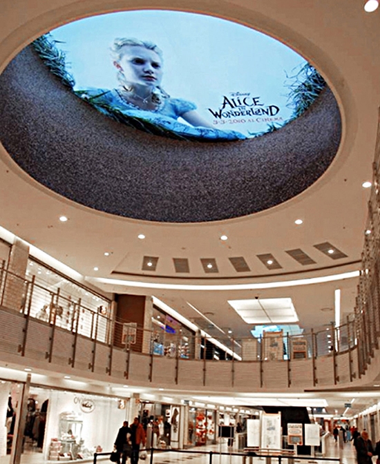 Bảng quảng cáo của Alice in Wonderland đã lựa chọn vị trí cực kỳ phù hợp khi in hình cô bé Alice đang nhìn xuống chiếc hang thỏ huyền thoại dẫn cô đến Xứ sở Thần tiên ngay trên trần một trung tâm thương mại.