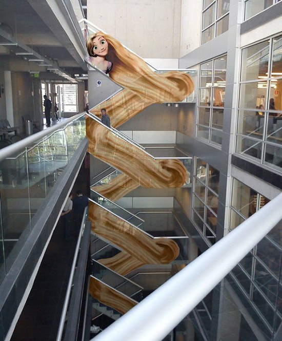 Công chúa tóc mây Rapunzel trong bộ phim Tangled đã tìm được vị trí xuất hiện đủ... dài để xõa mái tóc vàng óng mượt mà của mình ra mà không khiến ai phải phàn nàn.