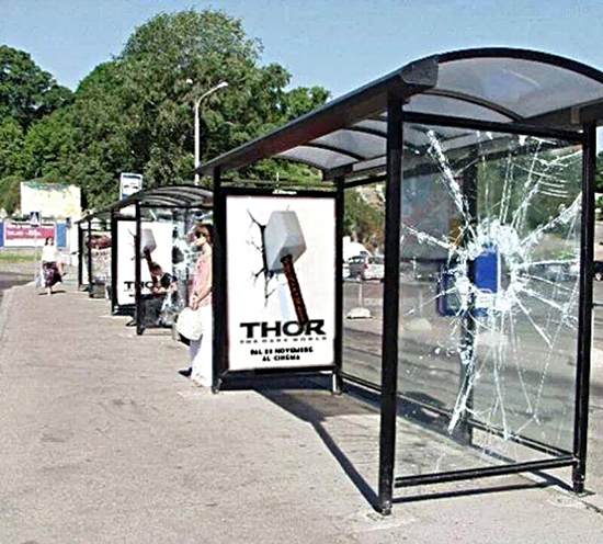 Thần sấm Thor trong bộ phim cùng tên có phải đã có cách quảng cáo cho phim hơi... bạo lực và phá hoại tài sản công không nhỉ? Nhưng dù thế nào thì trông những trạm chờ xe buýt này cũng hết sức ấn tượng