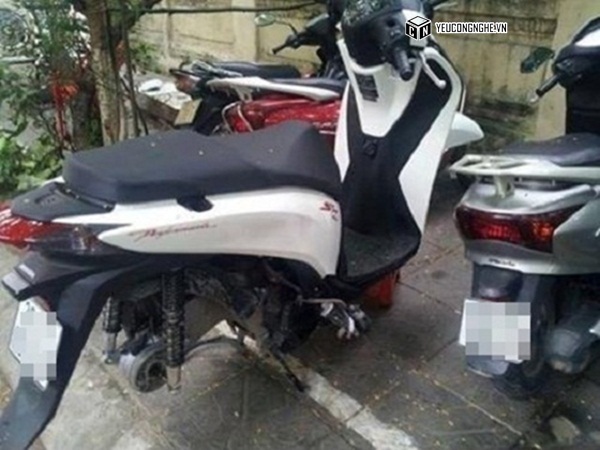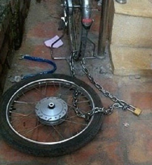 Vì xe bị khóa bánh nên hẳn tên trộm nghĩ đó là... phụ tùng quý giá nhất của chủ xe mà chừa nó lại chăng?
