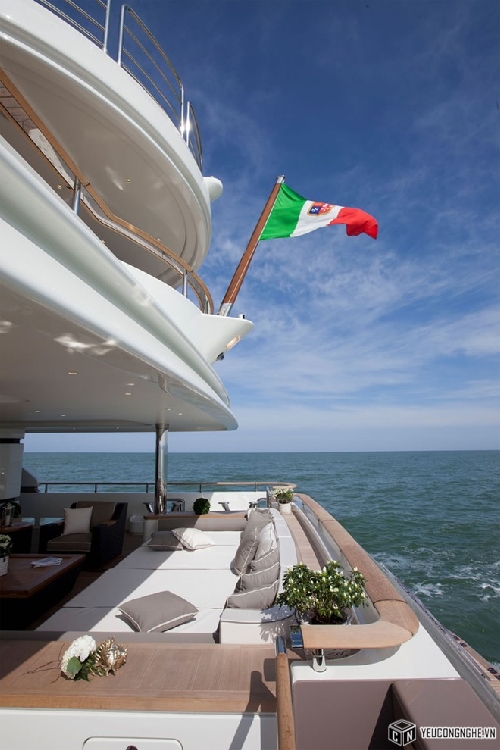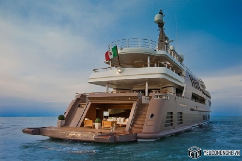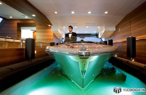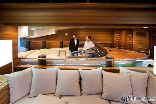 Điểm nổi bật nhất của du thuyền này là garage nổi độc đáo, cho phép chủ nhân con tàu cất giữ và dễ dàng lấy chiếc thuyền cao tốc Riva Iseo dài 8m mà không cần tàu nâng.